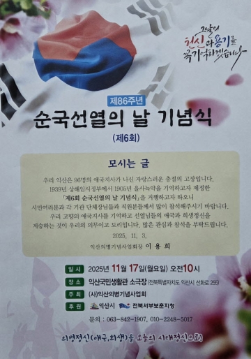 [익산=전북포커스 이정술 기자] (사)익산의병기념사업회(회장 이용희)는 17일(월) 오전 10시, 익산국민생활관 소극장에서 ‘제86주년 순국선열의 날 기념식’을 개최한다.